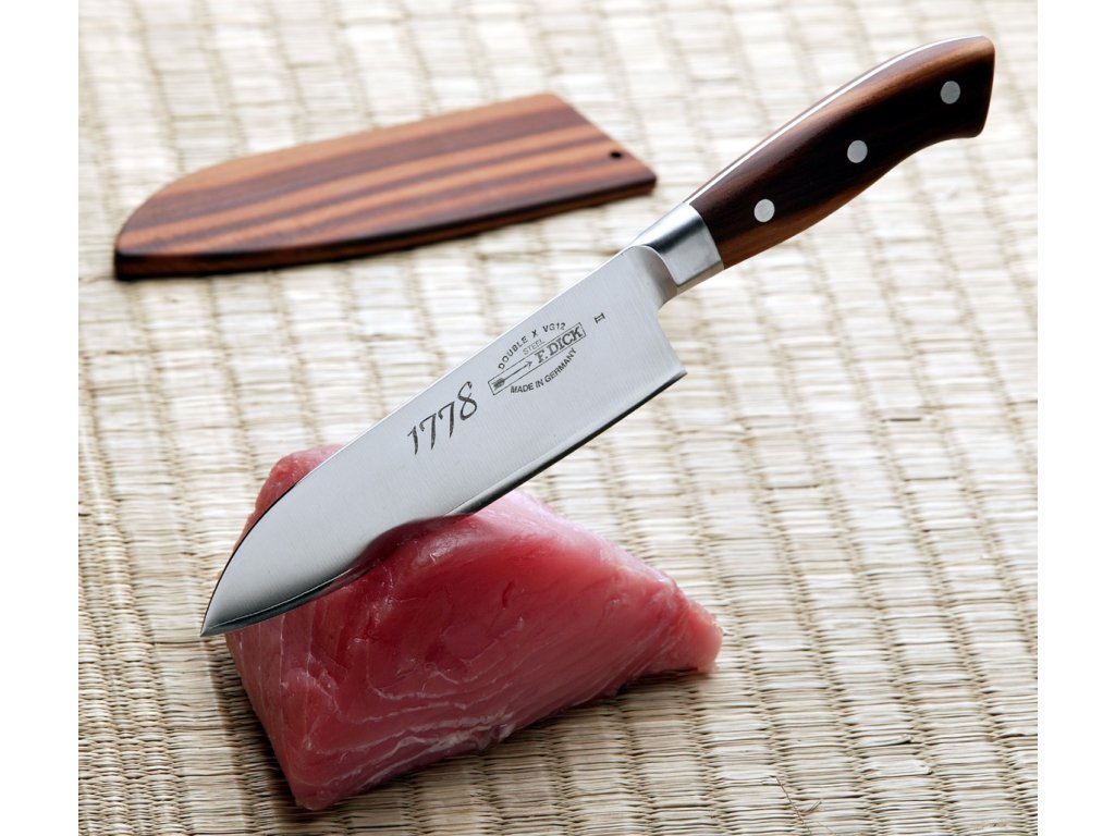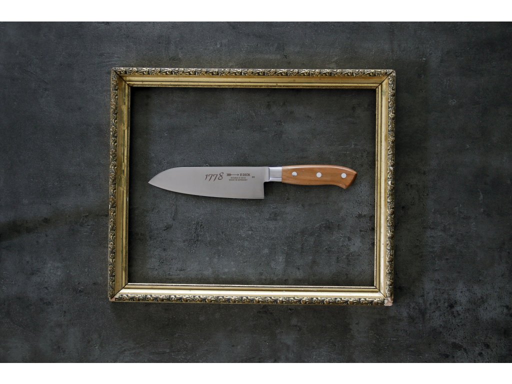 Smidd, begränsad jubileumsserie: kärnan i knivarna i denna exceptionella serie består av mycket tunna lager av höglegerat kolstål "Double X VG 12" med extrem hårdhet från 61˚ HRC. Resultatet är ett mycket effektivt snitt och en betydligt längre livslängd för klingan. Den skiktade kärnan av rostfritt stål är livsmedelsvänlig. Alla knivar i 1778-serien slipas och dressas för hand och handtaget och bladet tillverkas också av Dick-specialister.