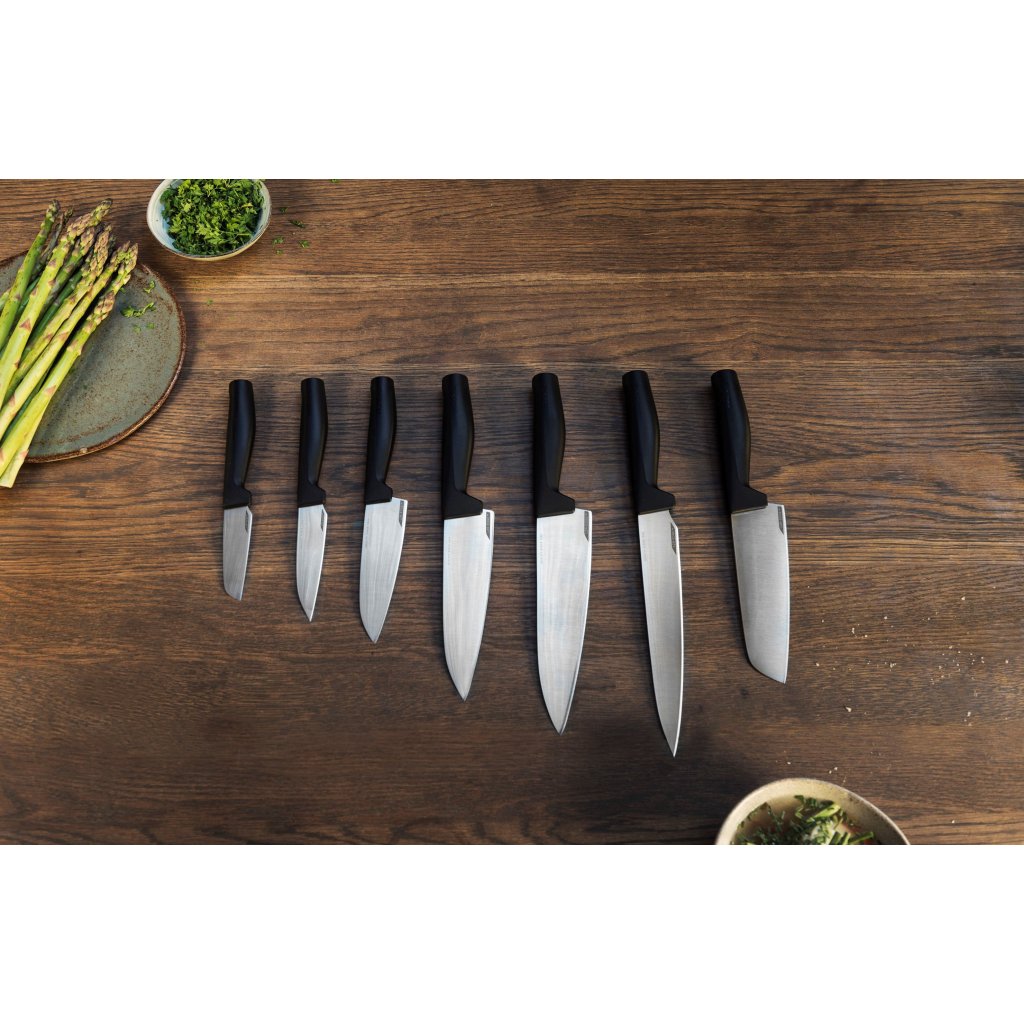 Santokukniven har sitt ursprung i Asien. Bladet är oftast kortare än hos en kockkniv och har dessutom en helt annan geometri. Ordet Santoku betyder översatt "kniv av de tre dygderna". Den lätta vikten, det tunna bladet och den breda spetsen gör att du kan skära mycket smala och små former. Fiskars santoku Hard Edge-kniven är idealisk för att skiva lök, tomater och andra grönsaker, t.ex. till sallader, och passar även för att tillaga kött, fisk eller hacka örter. Knivbladet av högkvalitativt, hårt rostfritt stål håller skärpan länge tack vare den speciella slipningstekniken LZR-EDGE™.