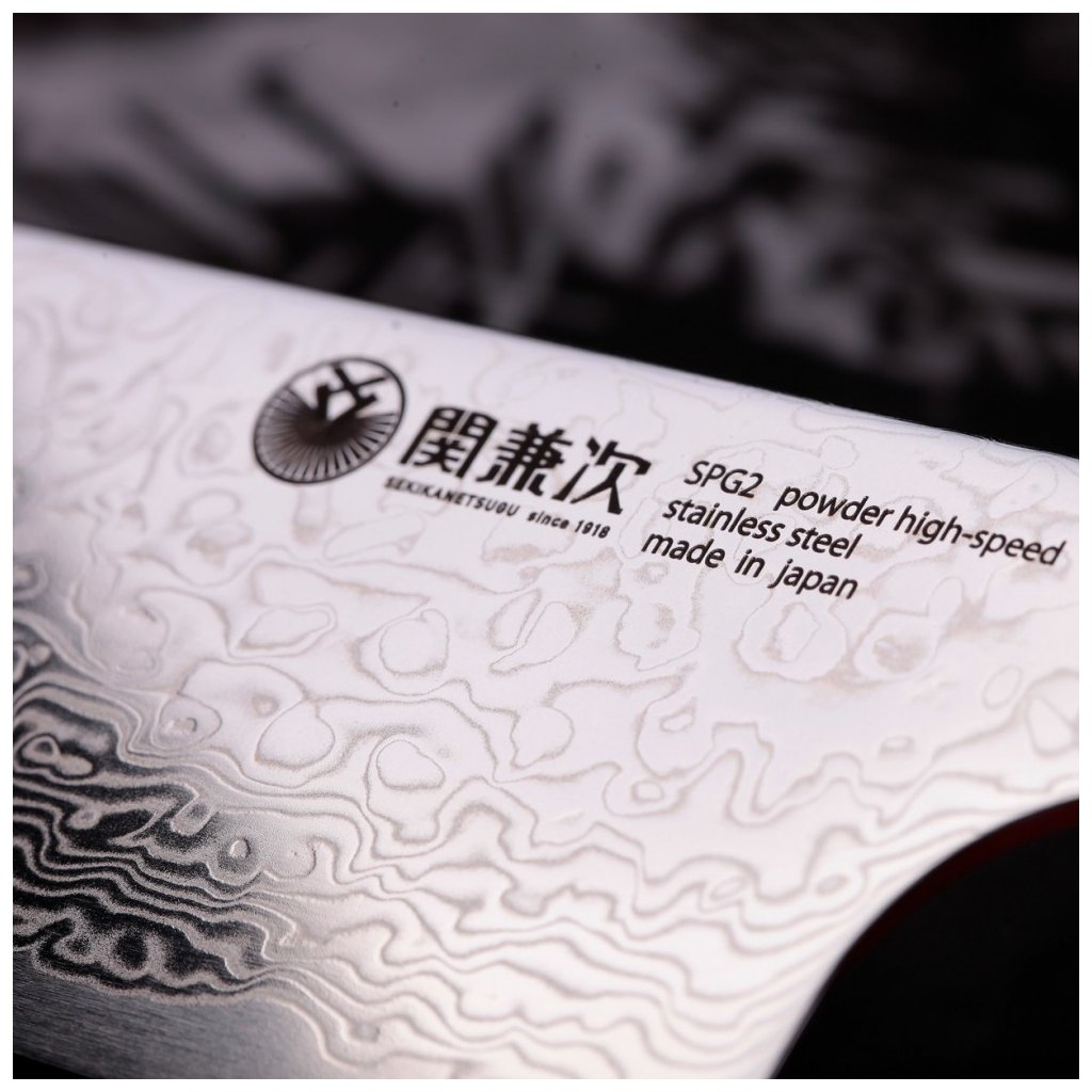 Kniv KIRITSUKE / Santoku ZUIUN har en ultraskarp skärkärna tillverkad av japanskt SPG2 pulverstål, som är mycket väl skyddat mot korrosion. Japanskt pulverstål SPG2 har en långvarig skärpa med hårdheten R63 +/- 1 Rockwell. Kärnan av japanskt pulverstål SPG2 är inklämd mellan 62 lager av 2 rostfria damaskusstål, som ger exceptionell hållbarhet och seghet. Det perfekt balanserade, exakt avsmalnande japanska bladet med ett skimrande damascenermönster minimerar friktionen vid skärning och förhindrar att materialet som ska skäras fastnar på bladet. Mönstret som liknar krusningar på ytan av sanddyner i öknen är unikt, kan inte upprepas och kommer att bli en symbol för din individualitet.