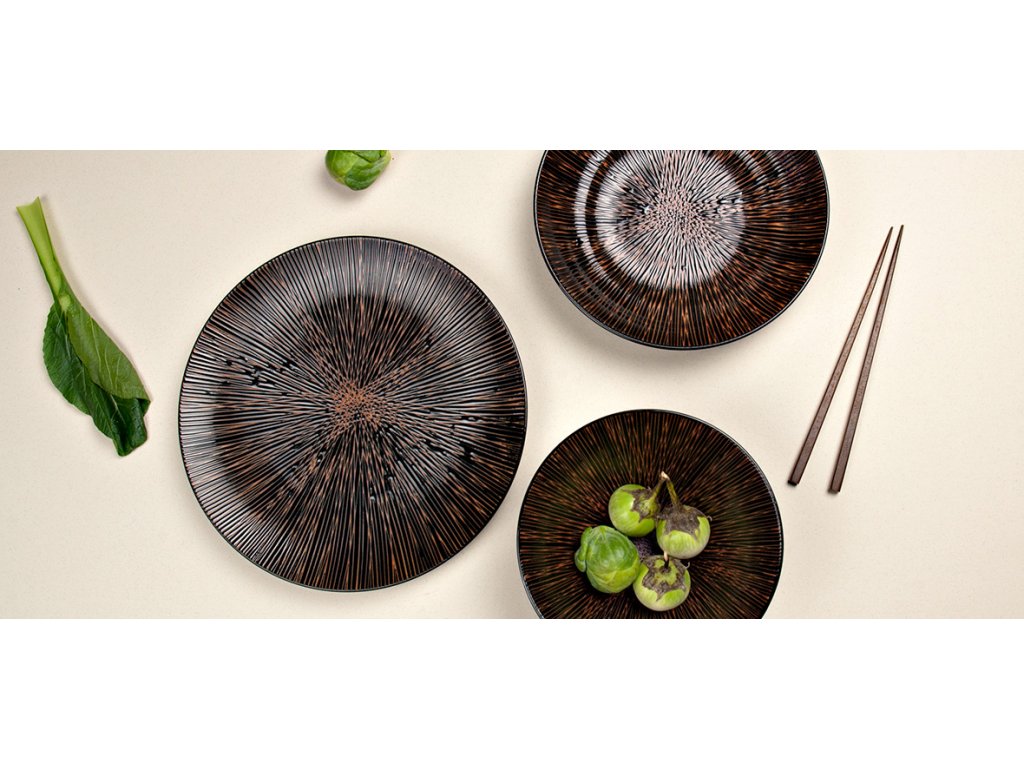 Porslinet från kollektionen Bronze Converging har en matt svart färg med ränder som känns vid beröring och har en glansig yta.
