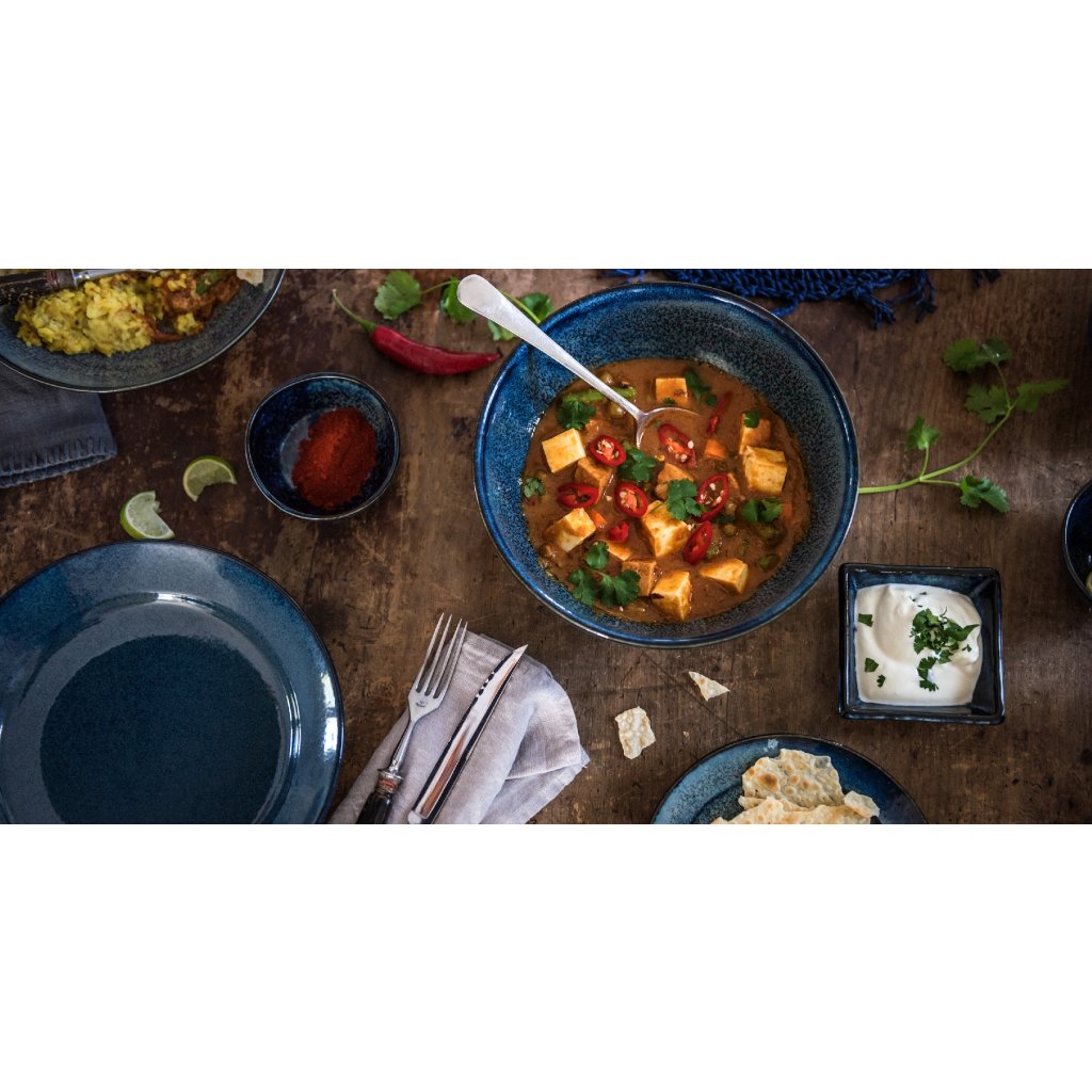 Porslinskollektionen Indigo Blue imponerar särskilt med sin djupblå färg. En annan mycket intressant egenskap är de olika ytbehandlingarna på insidan och utsidan. Ytan är glansig på insidan och matt på utsidan. Denna kontrast är mycket intressant och gör disken i denna kollektion till ett unikt, nästan konstnärligt objekt som kommer att se bra ut i ditt hem.