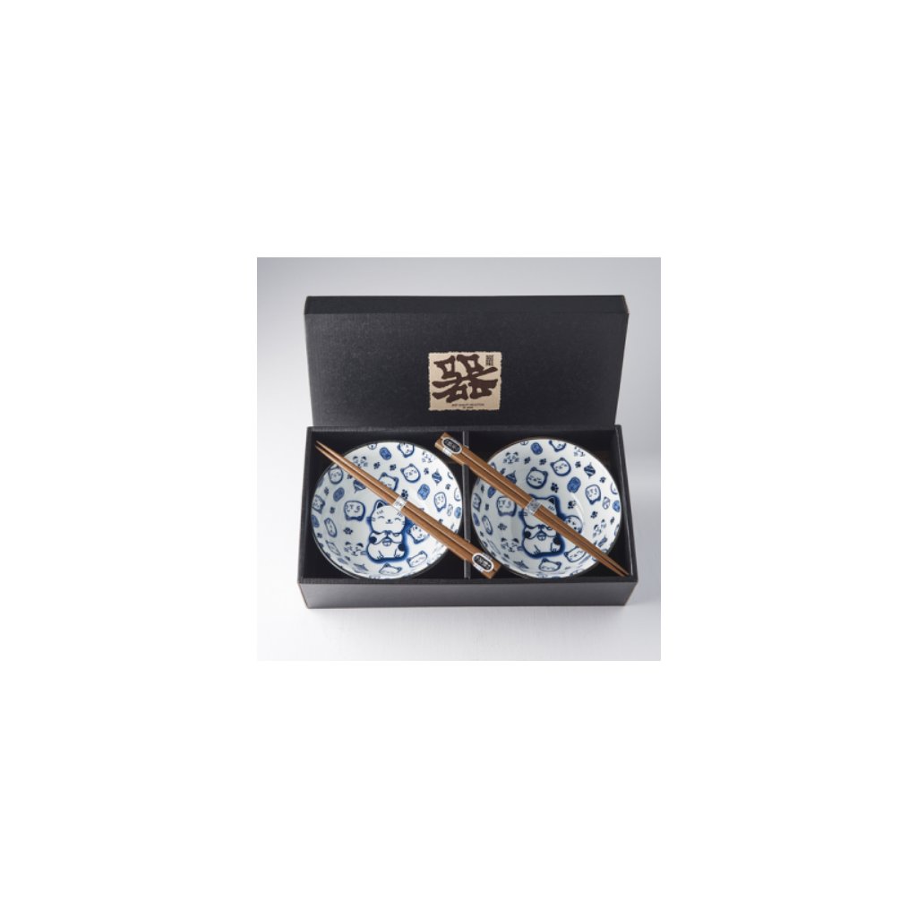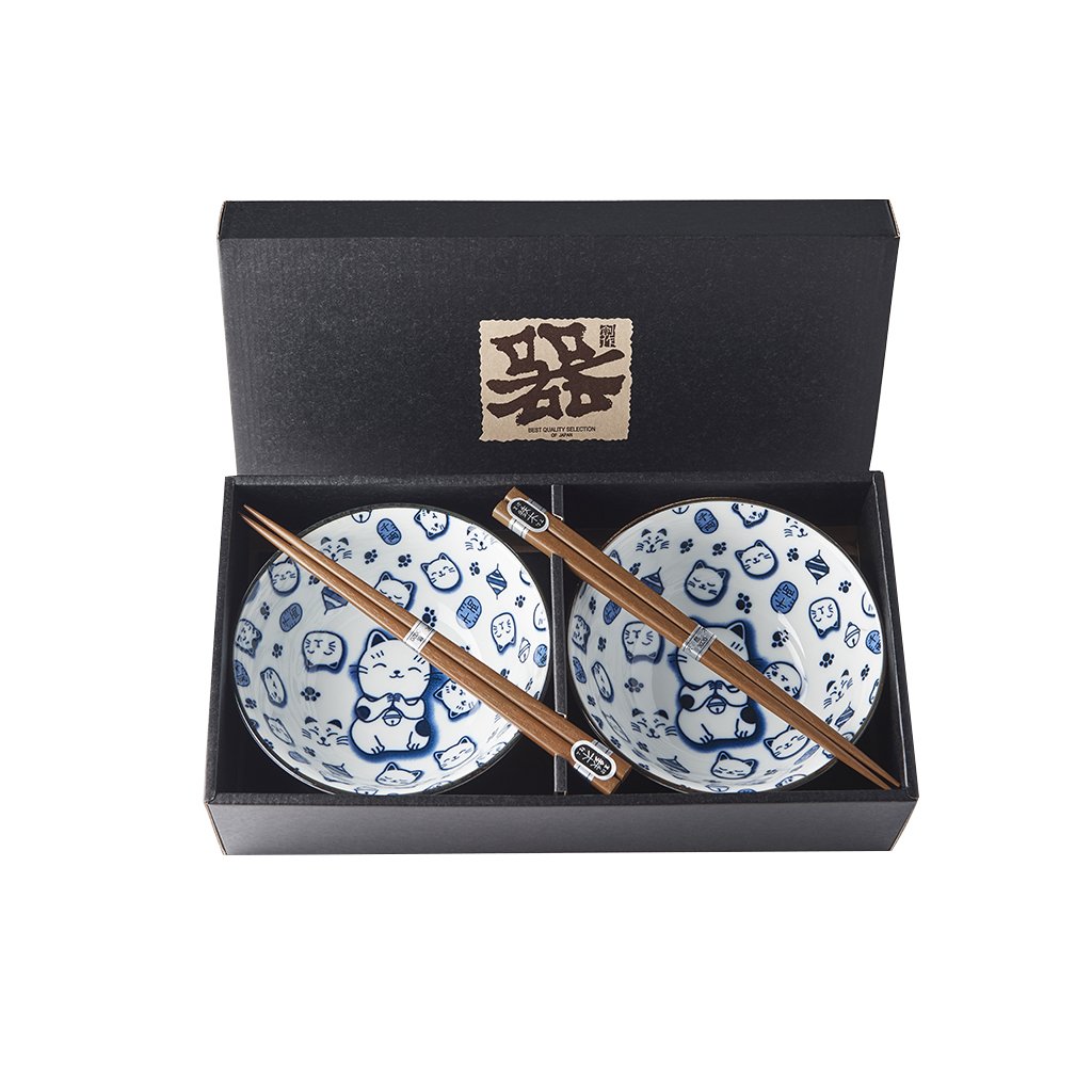 Setet innehåller 2 par ätpinnar i trä och 2 skålar med ett mönster av blå japanska katter mot en vit bakgrund. Skålarnas kant är kantad med silverfärg. Setet levereras i en elegant svart presentförpackning och passar därför utmärkt som gåva till vänner eller affärspartners.