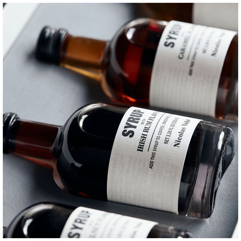 - presentförpackning innehållande 4 siraper: kola, vanilj, irländsk rom och hasselnöt