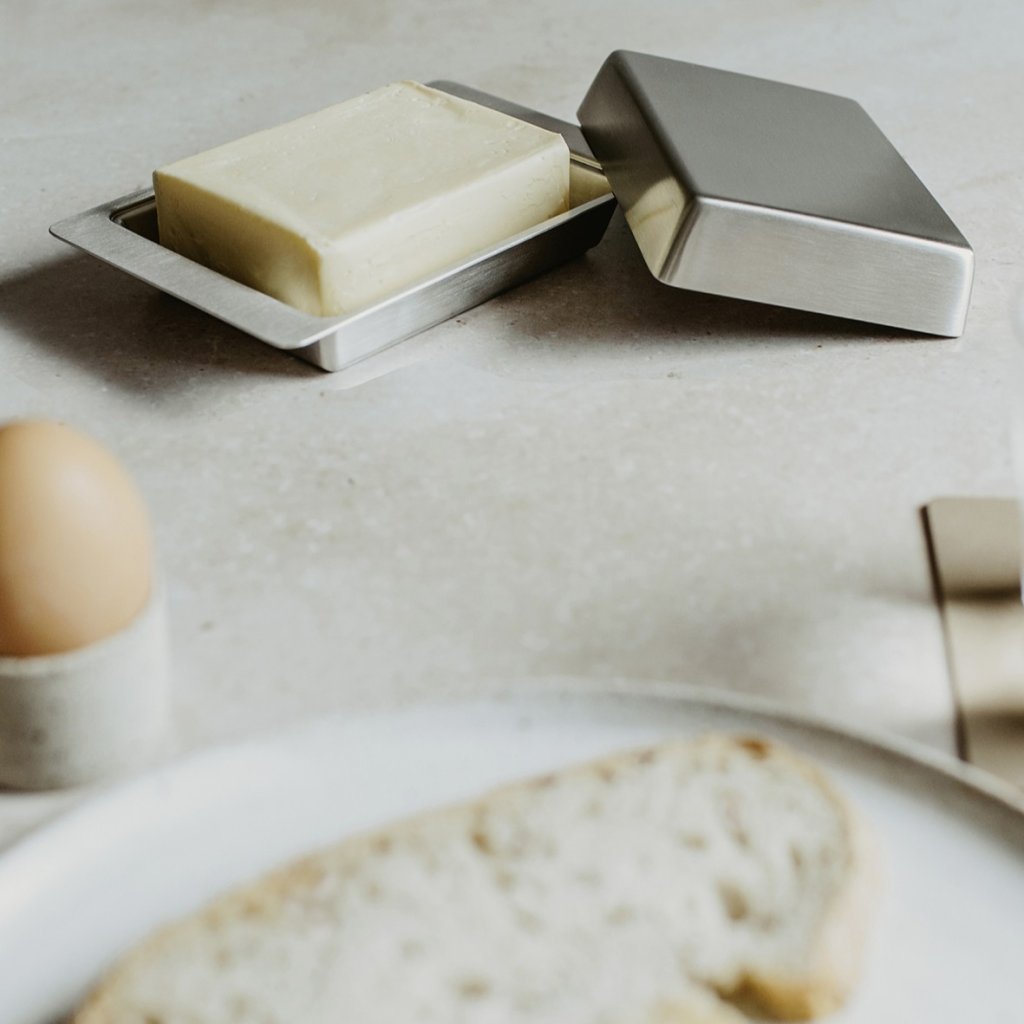 - ACIO smörskål i rostfritt stål från märket Zack är utformad för hygienisk förvaring av smör och elegant servering på bordet.