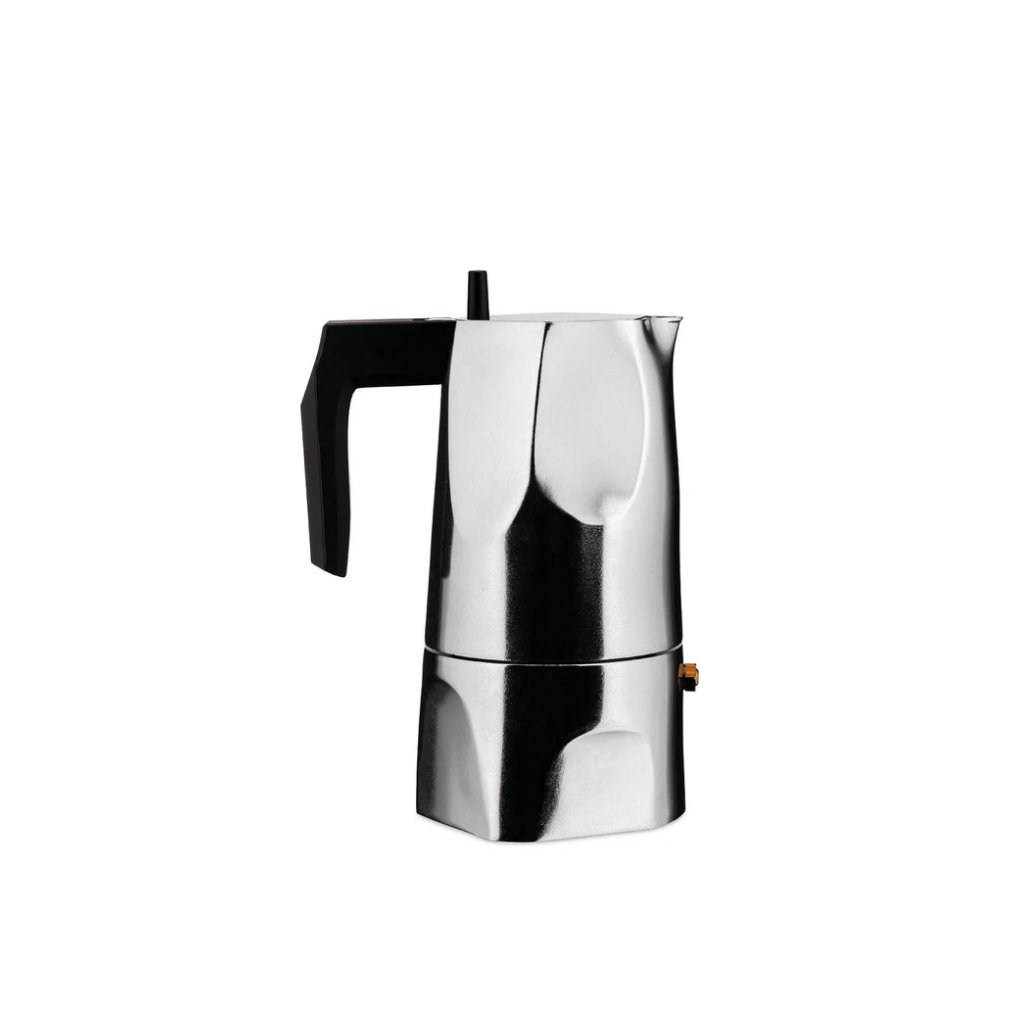 Den sicilianska designern Mario Trimarchis 1-kopps moka kaffemaskin i aluminium är mycket ergonomisk och enkel att hantera när den öppnas och stängs.