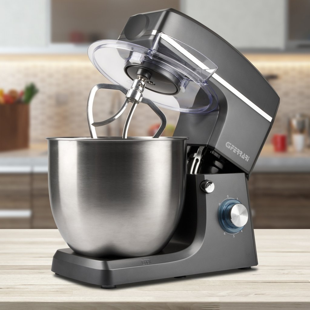 - Tillbehör inkluderar stående mixer med krokfäste, en blandningsanordning för mjuka degar och en visp visp i rostfritt stål