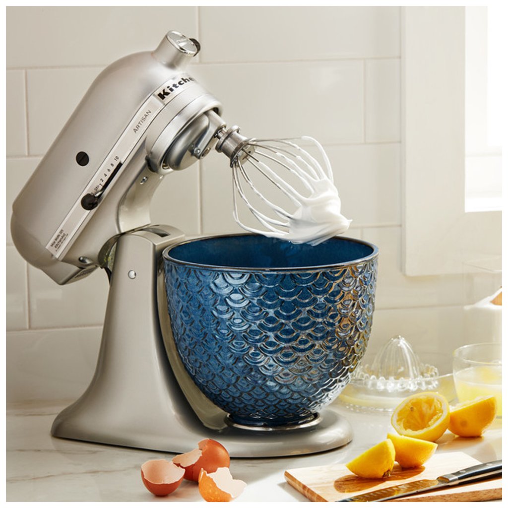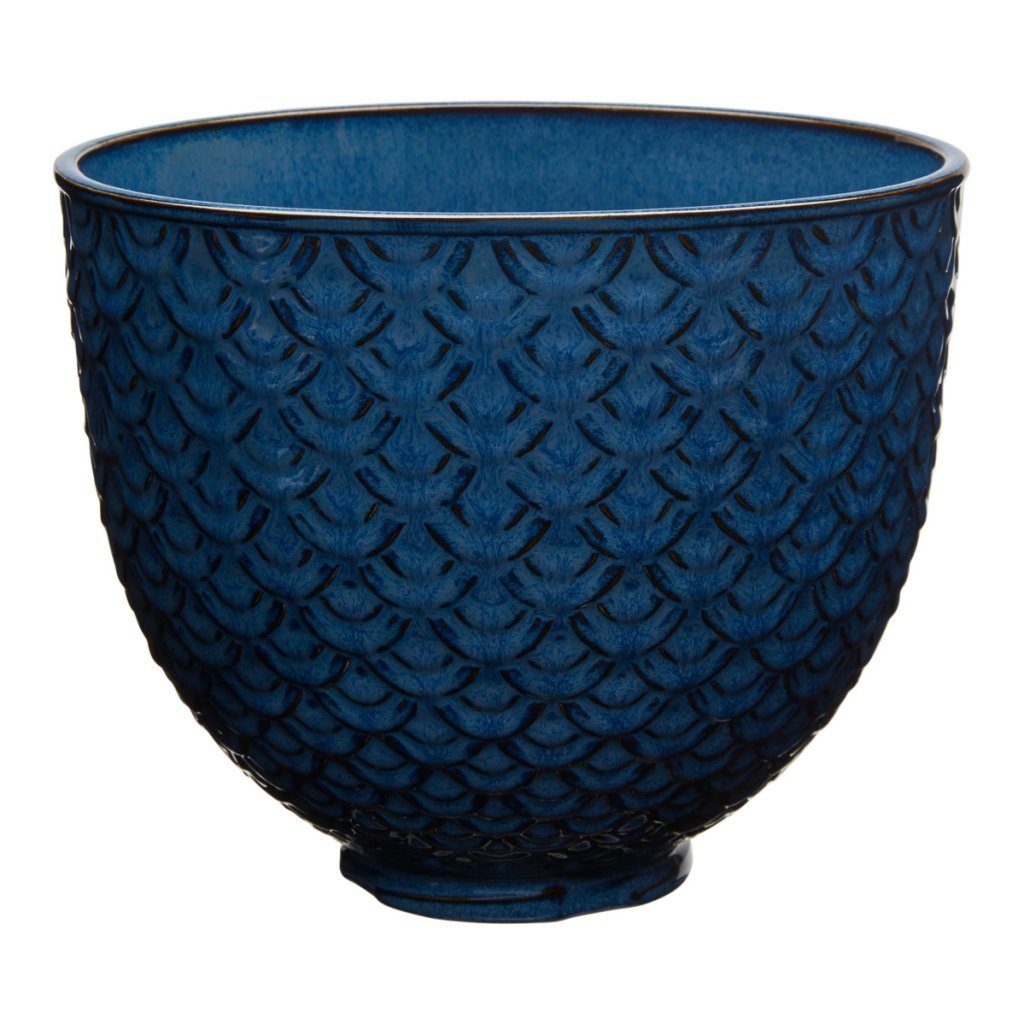 Den keramiska skålen KitchenAid 4,83 l är tillverkad av slitstark keramik och är härdad med titan, vilket gör den mycket motståndskraftig mot sprickor, nötning eller sprickor. Den har en modern, handgjord design med ett fiskfjällsmotiv. Den är 30% lättare än sin föregångare, vilket gör det lättare att transportera råmaterial.