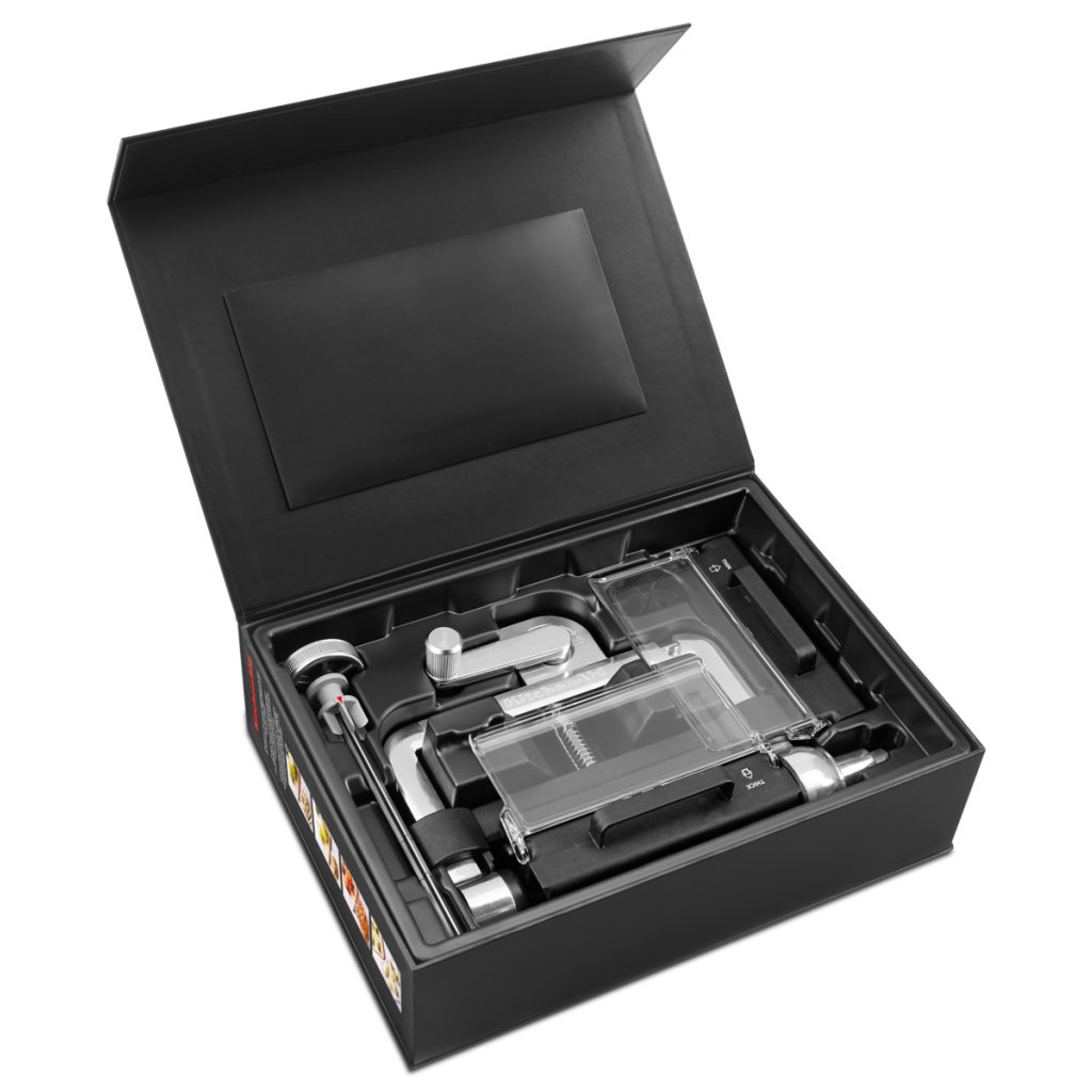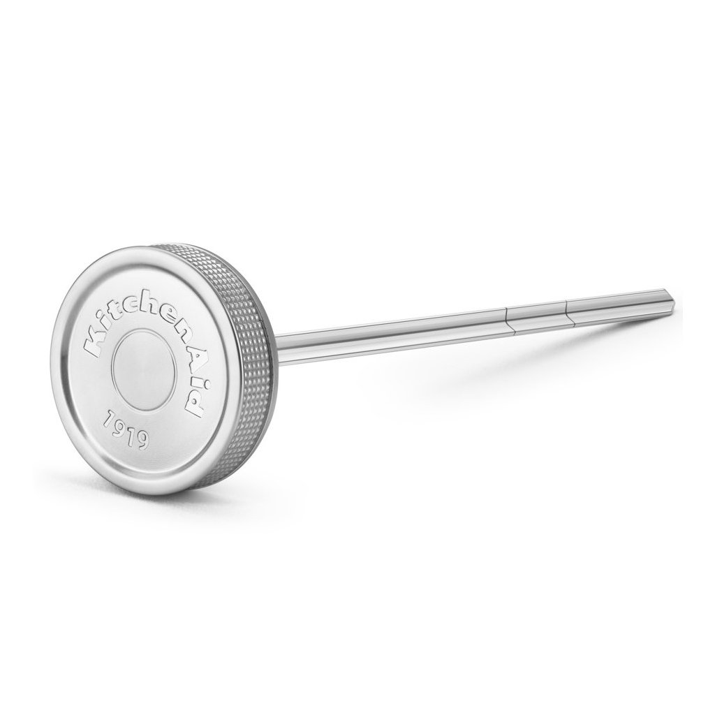 Tillbehör för matberedare KitchenAid, används för att skiva grönsaker eller göra hemlagad pasta. I paketet ingår ett tillbehör för själva grönsakerna och två blad i rostfritt stål för att skära 1,3 mm och 1,8 mm tjocka skivor.