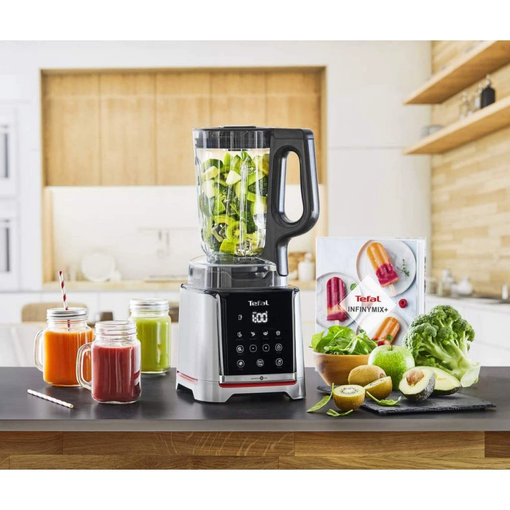Med InfinyMix+ bordsblandare frÄn Tefal kan du tillreda lÀckra frukt- eller grönsakssmoothies, puréer, smoothies, desserter, glass och mycket mer. Du kan vÀlja ett av fem automatiska program eller vÀlja en av tio hastigheter och sjÀlv stÀlla in önskad blandningstid.