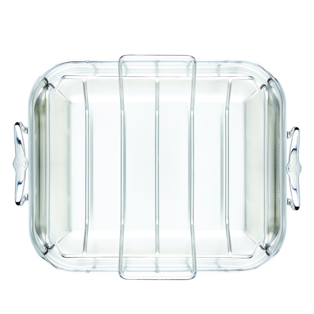 - v-format ställ i rostfritt stål som lyfter upp kött, fågel och andra kulinariska skapelser och främjar snabb och jämn tillagning