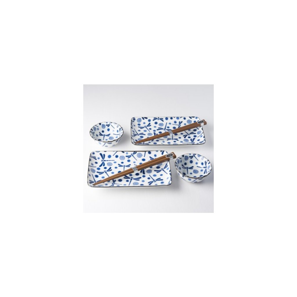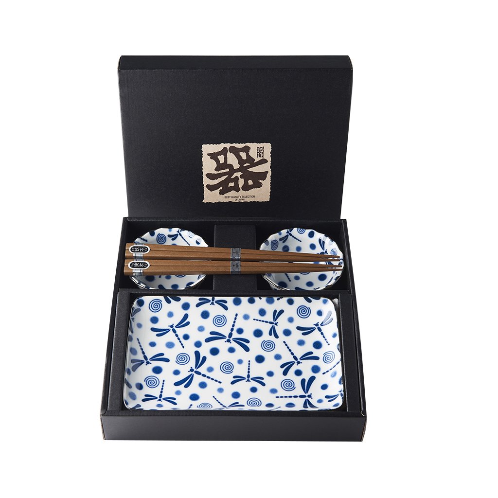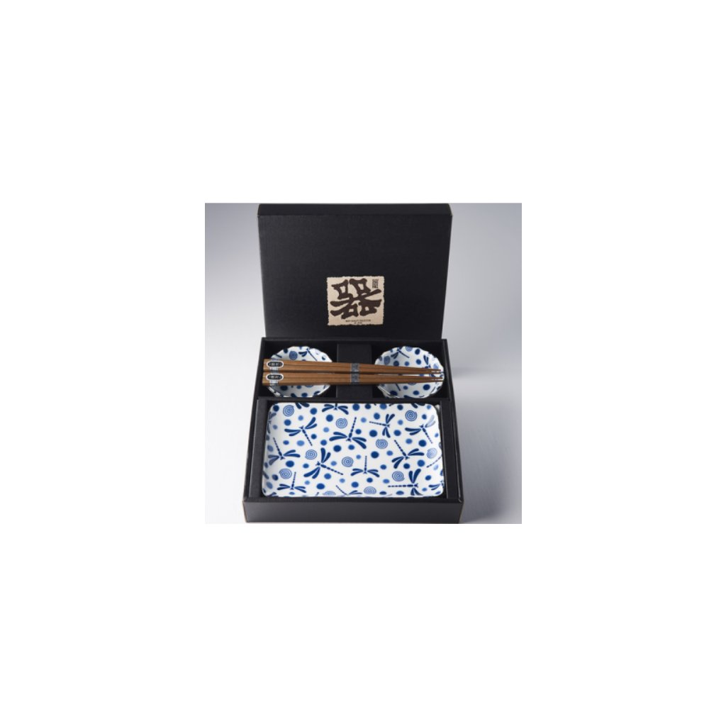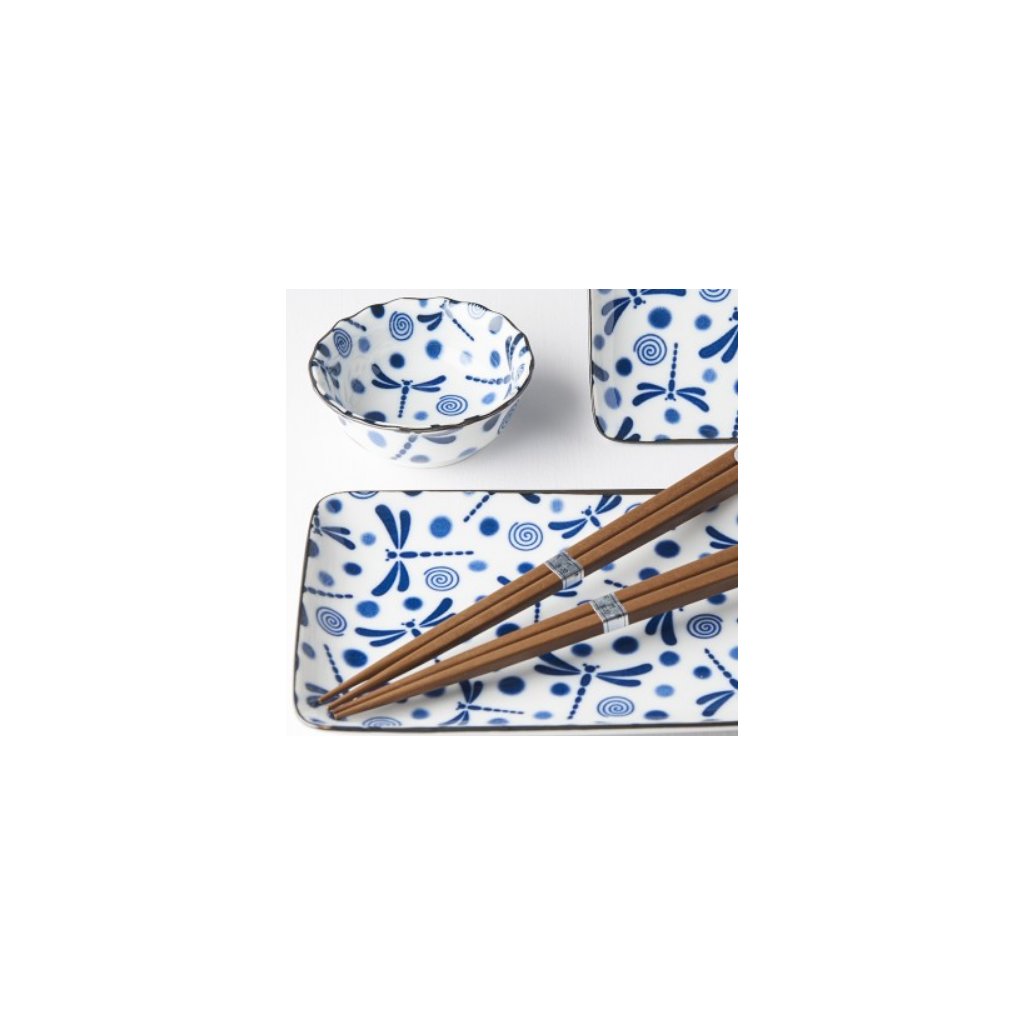 Tallrikarna och skålarna är vita med blå trollsländor, spiraler och prickar. Använd setet för att servera sushi med såser, men du kan också använda skålarna för sake. Setet levereras i en svart presentförpackning och är därför lämpligt som gåva.