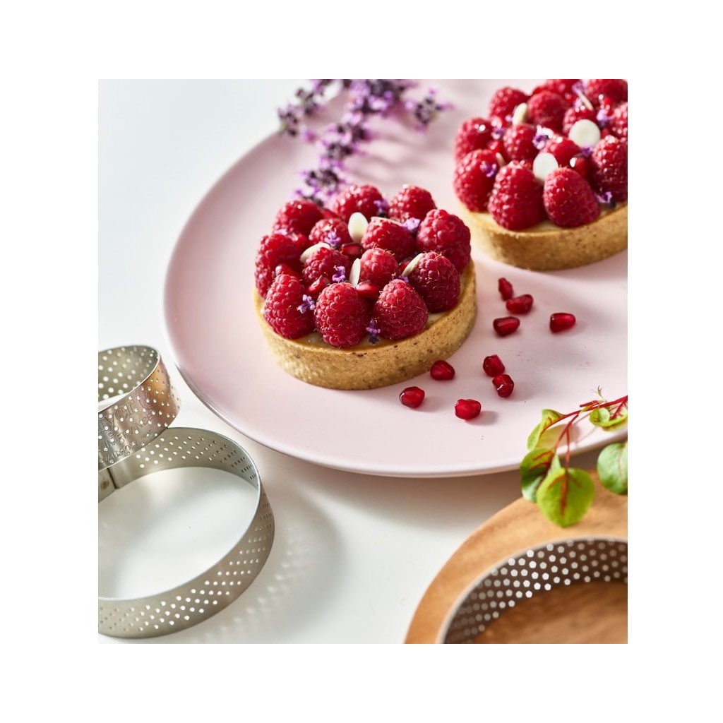 Den perforerade runda bakformen de Buyer är idealisk för tillagning av olika desserter och kakor, smördeg och mördeg. Hålen på formens sida gör att kakornas kanter gräddas jämnt. Formen, som utvecklats i samarbete med Ecole du Grand Chocolat Valrhona, är tillverkad av fjäderbelastat rostfritt stål och har en rak kant som ger en felfri finish. Den är inte svetsad och återgår alltid till sin ursprungliga form när den släpps.