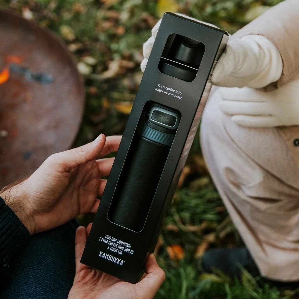 - Presentförpackning Kambukka innehåller en designer termosmugg ETNA med en volym på 500 ml och två korkar - 3-i-1-kork ETNA och skruvkork RENO i svart