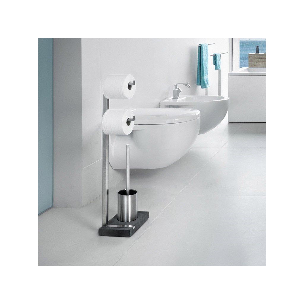 Toalettpappersstället för två rullar MENOTO är tillverkat av rostfritt stål och svart polystone, ett tungt kompositmaterial som påminner om stengods. Kombinationen av dessa två material ger ditt badrum en lyxig känsla. Stativet har en hållare för två rullar toalettpapper och en toalettborste med handtag i rostfritt stål. Det svarta borstfacket i plast kan tas bort för enklare och mer hygienisk rengöring, toalettborsthuvudet kan bytas ut vid behov.