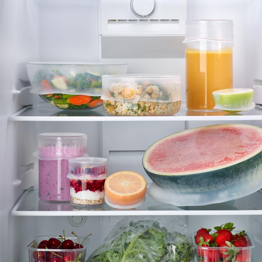 - Kitet möjliggör lufttät förvaring av mat i kylskåpet utan att överföra lukt och hjälper till att bevara dess färskhet längre.