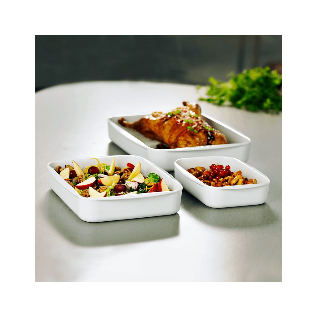 Tack vare principen att skapa en serie tallrikar med motsvarande mått kan Legio®-porslin kombineras med olika produkter från serierna Amfio och CLASSIC. Här hittar du dina favoriträtter i runda och ovala former.