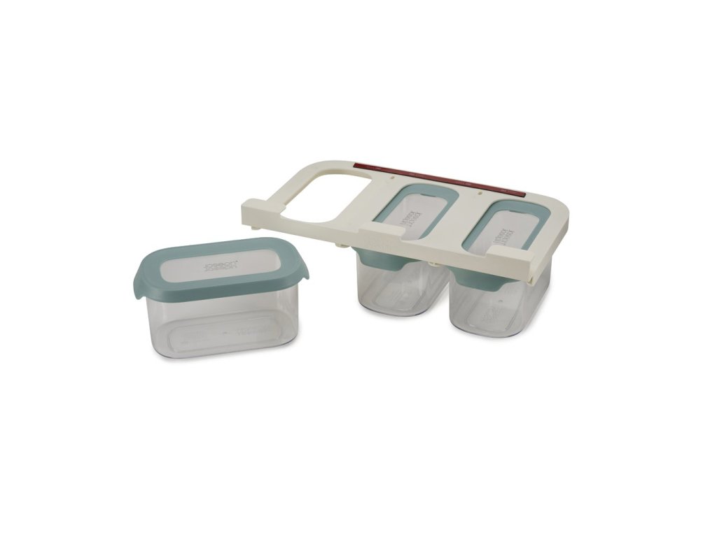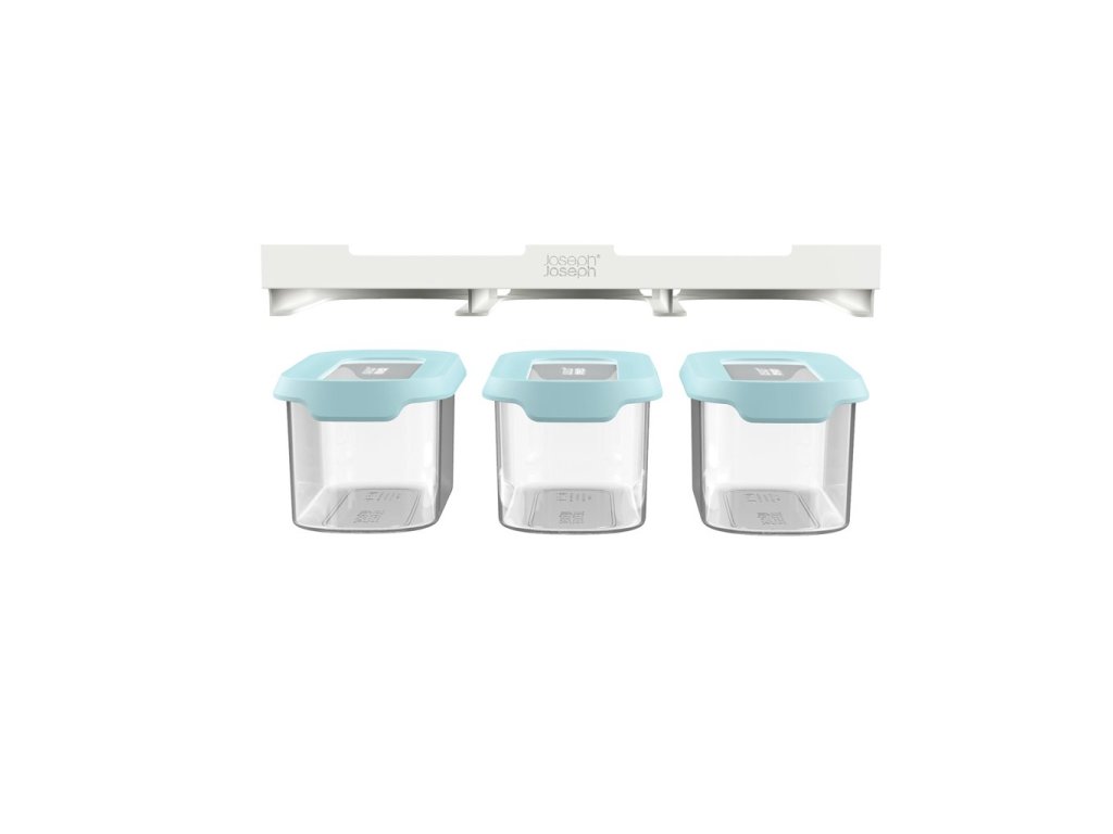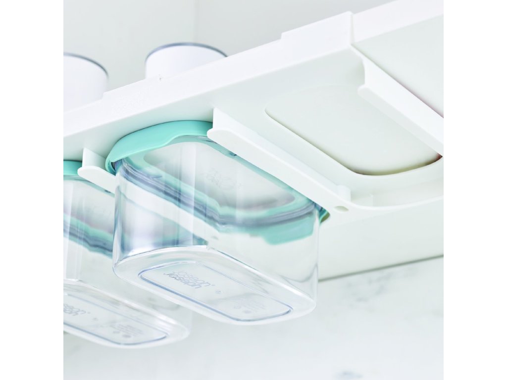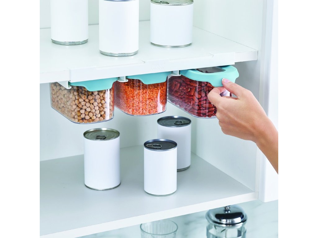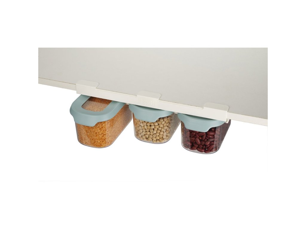 Med de innovativa JOSEPH JOSEPH CupboardStore matburkarna kan du använda det sista lediga utrymmet under hyllorna i ditt köksskåp. I CupboardStore-serien finns t.ex. denna uppsättning med 3 st 900 ml kannor som skjuts in i hållare monterade på hyllans undersida. Hållarna är stabiliserade med kraftig 3M-tejp. Behållarna är lufttäta och lämpar sig för förvaring av torrfoder.