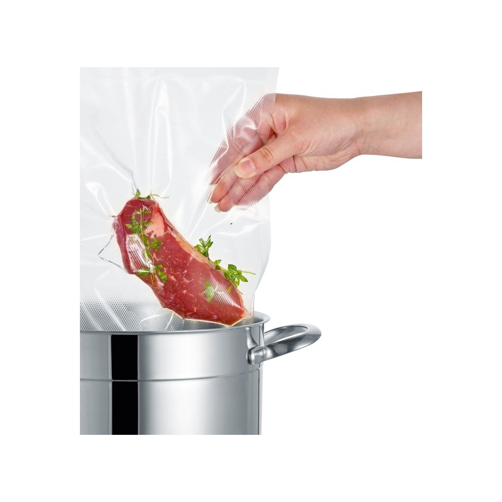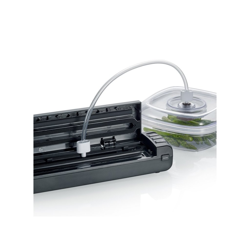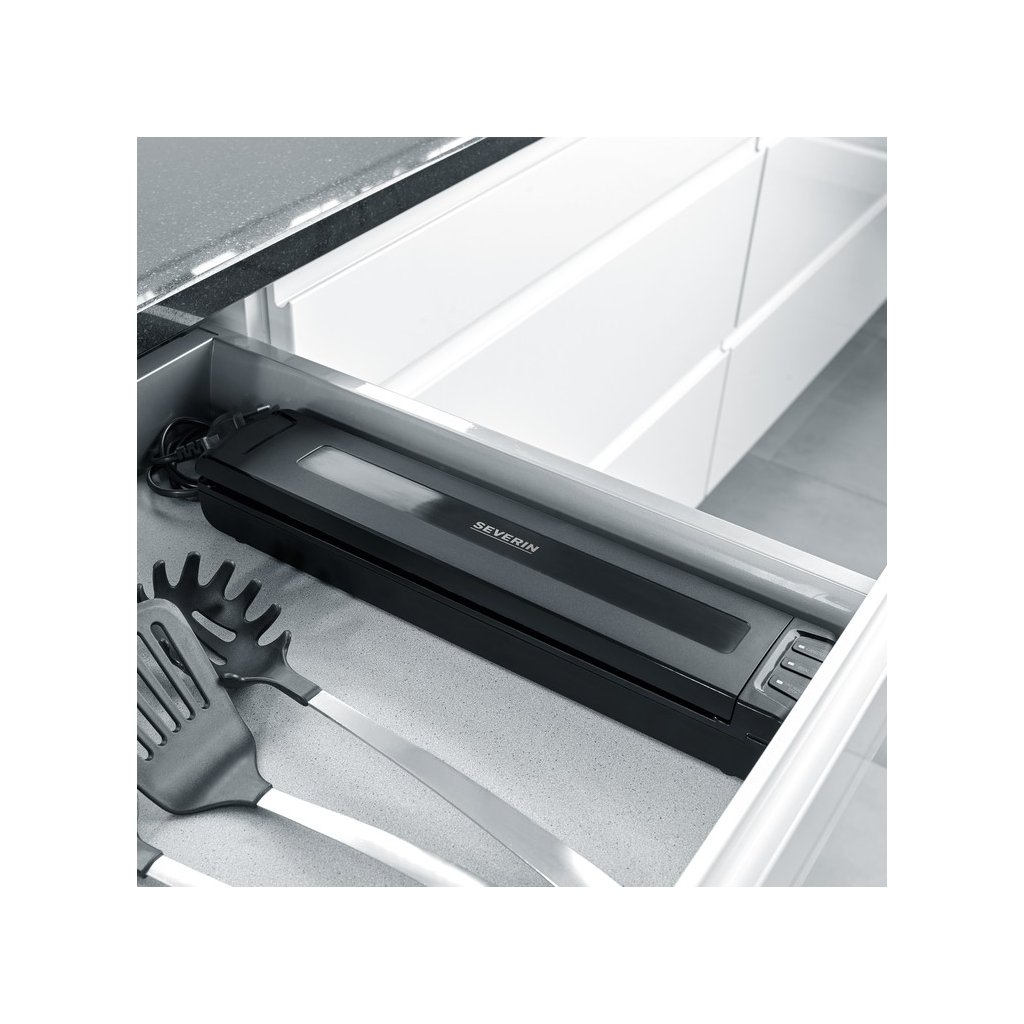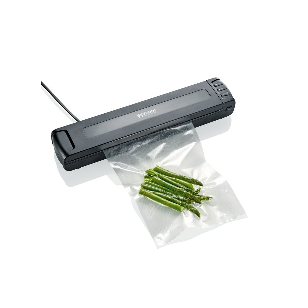 Vill du bevara livsmedel under lång tid? MedEVERIN FS 3601 säkerställer du deras exceptionella hållbarhet och sparar utrymme i frysen. SEVERIN med inbyggd svetsfunktion kan även användas i ditt kök. För in maten i en speciell påse eller folie i maskinen och sug ut luften med en enda knapptryckning. När dammsugningen är klar är det bara att svetsa ihop och maten är förseglad. Skapar svetsar med en maximal bredd på 30 cm. Enheten uppnår en effekt på 100 W. LED indikatorn informerar dig om hur dammsugningen fortskrider. Dammsugaren är enkel att använda eftersom den är automatisk. Förpackningen innehåller 5 rullar med folier.