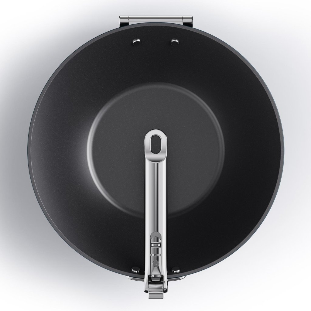 - Tack vare den fällbara mekanismen kan handtaget enkelt fällas längs wokens kropp, vilket gör det möjligt att spara upp till femtio procent utrymme jämfört med vanliga köksredskap.
